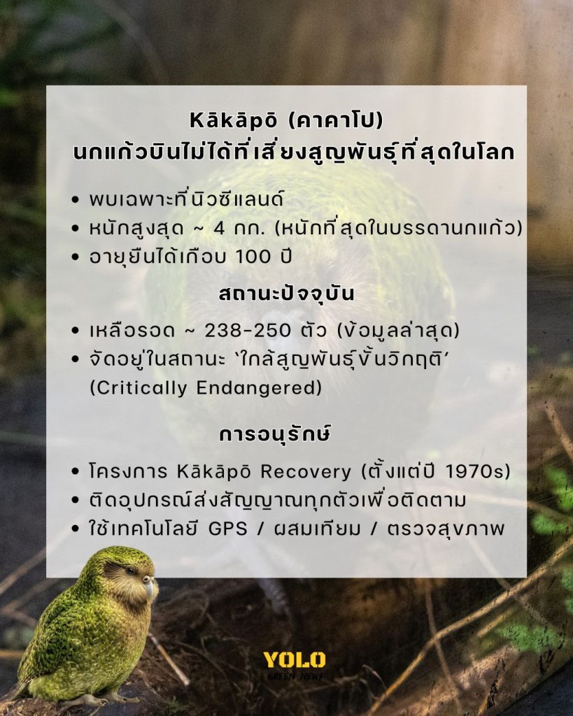 คาคาโป (Kākāpō) คือนกแก้วสายพันธุ์หายากจากนิวซีแลนด์ที่มีลักษณะพิเศษไม่เหมือนใคร มันไม่สามารถบินได้ มีน้ำหนักมากที่สุดในบรรดานกแก้ว โดยเพศผู้บางตัวหนักได้เกือบ 4 กิโลกรัม และมีอายุยืนยาวเกือบร้อยปี ปัจจุบันคาคาโปถูกจัดให้อยู่ในกลุ่มสัตว์ใกล้สูญพันธุ์ขั้นวิกฤติ เนื่องจากเหลือรอดเพียงประมาณ 250 ตัวทั่วโลกเท่านั้น