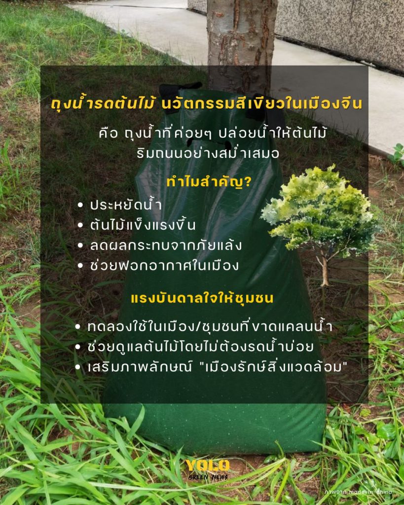 ที่ประเทศจีนได้มีการนำ “ถุงน้ำรดต้นไม้” มาใช้ดูแลต้นไม้ริมถนน ซึ่งถุงเหล่านี้จะค่อยๆ ปล่อยน้ำออกอย่างสม่ำเสมอ ทำให้ต้นไม้ได้รับความชุ่มชื้นที่เพียงพอ แม้ในช่วงที่เกิดภัยแล้ง นวัตกรรมนี้ไม่เพียงช่วยประหยัดน้ำ แต่ยังช่วยให้ต้นไม้เติบโตแข็งแรงและมีส่วนช่วยปรับปรุงคุณภาพอากาศในเมือง ถือเป็นอีกหนึ่งไอเดียเพื่อความยั่งยืนที่สามารถต่อยอดมาใช้ในชุมชนของเราได้ ทั้งเพื่อดูแลสิ่งแวดล้อมและสร้างเมืองที่น่าอยู่มากขึ้น