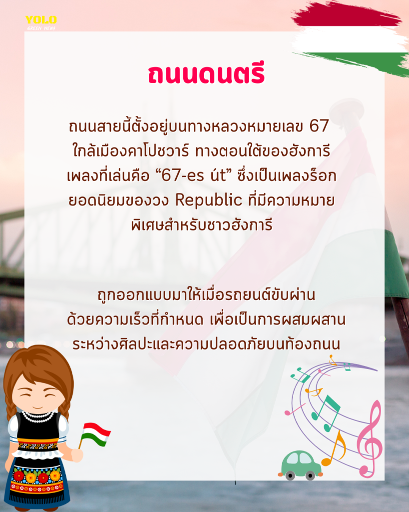 ขับรถแล้วได้ยินเสียงเพลง! ถนนดนตรีในฮังการีสร้างเสียงจากยางรถ ที่ประเทศฮังการี มี “ถนนดนตรี” จริง ๆ อยู่บนทางหลวงหมายเลข 67 ใกล้เมืองคาโปชวาร์ ซึ่งออกแบบให้เมื่อขับรถผ่านด้วยความเร็วที่กำหนด