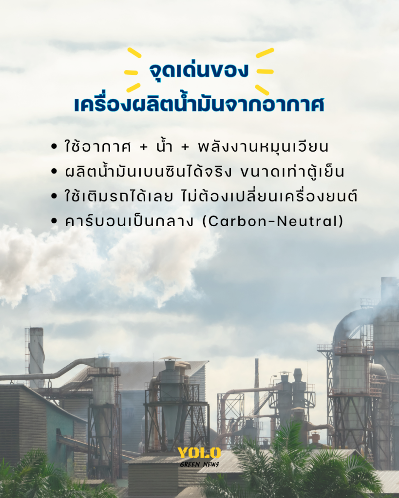 เครื่องขนาดเท่าตู้เย็นนี้ใช้เทคโนโลยีดักจับ CO₂ จากอากาศ และผลิตไฮโดรเจนจากน้ำ ก่อนนำมาสังเคราะห์เป็นน้ำมันเบนซิน พร้อมใช้งานกับรถยนต์ทั่วไปได้ทันที โดยไม่ต้องปรับเครื่องยนต์ และที่สำคัญ ปล่อยคาร์บอนเท่ากับที่ดึงกลับมาใช้ จึงถือเป็นเชื้อเพลิงคาร์บอนเป็นกลาง (carbon-neutral)
