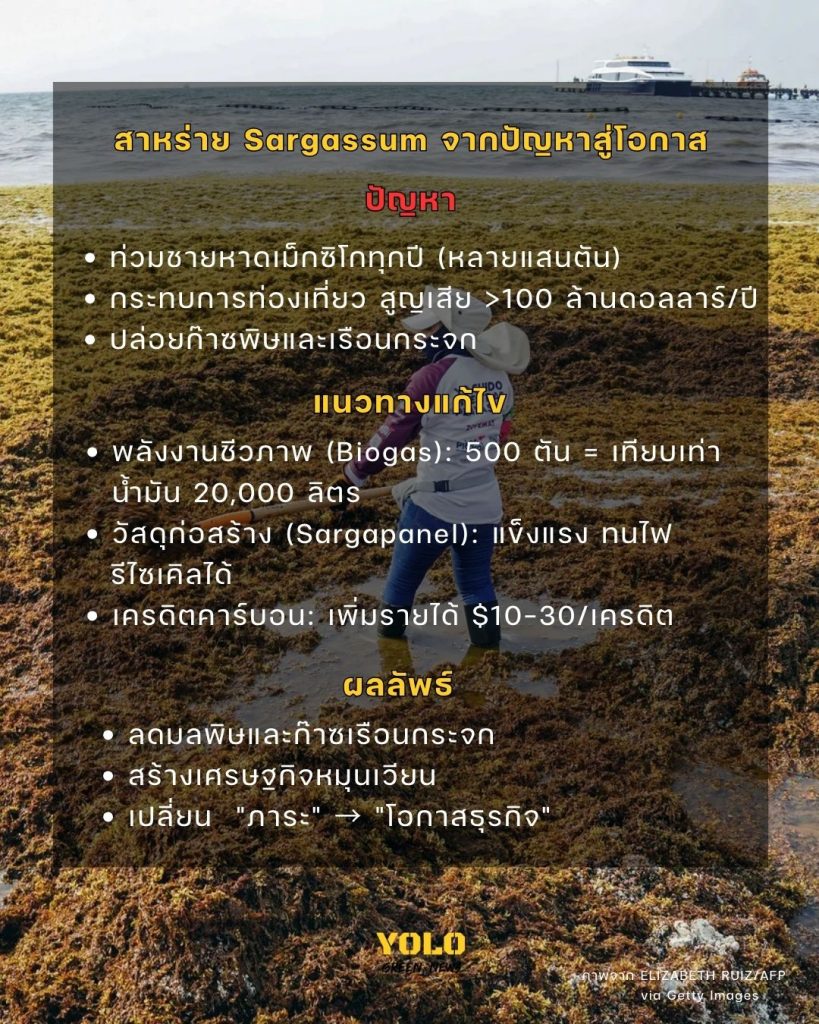 ทุกปีชายหาดแคริบเบียน โดยเฉพาะในเม็กซิโก ต้องเผชิญปัญหาสาหร่าย Sargassum ปริมาณมหาศาลที่ซัดขึ้นฝั่ง สร้างความเสียหายต่อการท่องเที่ยว สิ่งแวดล้อม และเศรษฐกิจ โดยโรงแรมต้องเสียค่ากำจัดกว่าร้อยล้านดอลลาร์ต่อปี ขณะเดียวกันสาหร่ายที่เน่าเปื่อยยังปล่อยก๊าซพิษและก๊าซเรือนกระจก