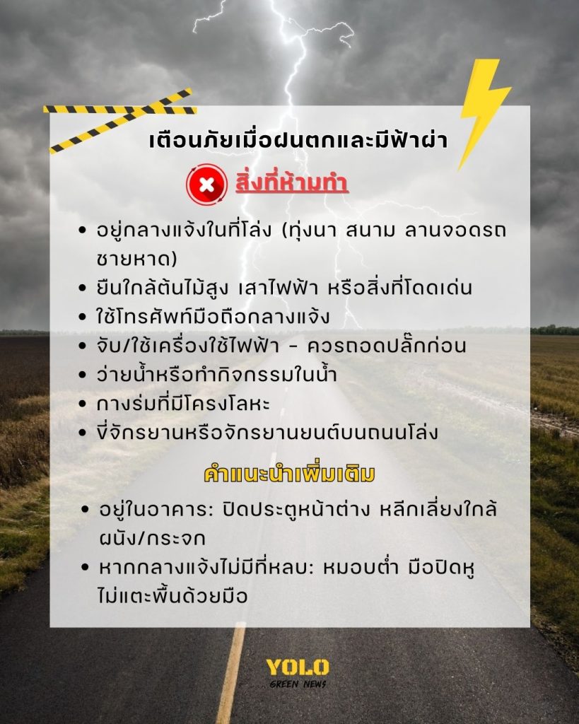 ในช่วงฤดูฝน หลายพื้นที่มักเผชิญกับพายุฝนและฟ้าผ่า ซึ่งอาจก่อให้เกิดอันตรายถึงชีวิต เพื่อความปลอดภัย ควรหลีกเลี่ยงการอยู่กลางแจ้งในที่โล่ง ไม่ยืนใกล้ต้นไม้สูงหรือเสาไฟฟ้า และงดการใช้โทรศัพท์มือถือกลางแจ้ง ขณะเดียวกันควรถอดปลั๊กเครื่องใช้ไฟฟ้า หลีกเลี่ยงการว่ายน้ำหรือทำกิจกรรมในน้ำ รวมถึงไม่ใช้ร่มที่มีโครงโลหะและไม่ขี่จักรยานหรือจักรยานยนต์บนถนนโล่ง หากอยู่ในบ้านควรปิดประตูหน้าต่างและอยู่ห่างจากผนังหรือกระจก แต่หากจำเป็นต้องอยู่กลางแจ้งโดยไม่มีที่หลบ ควรหมอบตัวต่ำ มือปิดหู และหลีกเลี่ยงการสัมผัสพื้นโดยตรง การปฏิบัติตามข้อควรระวังเหล่านี้จะช่วยลดความเสี่ยงและปกป้องชีวิตได้เมื่อเกิดฟ้าผ่า