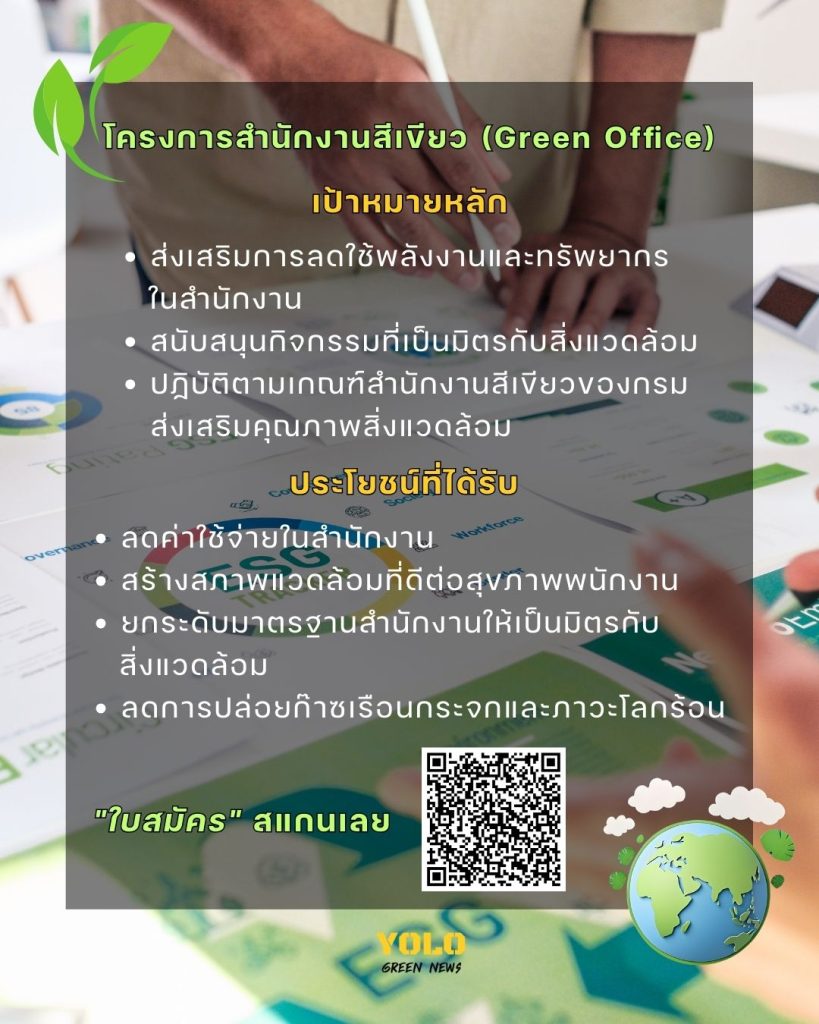 โครงการสำนักงานสีเขียว (Green Office) มุ่งส่งเสริมการทำงานภายในสำนักงานให้เป็นมิตรกับสิ่งแวดล้อม ผ่านการลดการใช้พลังงานและทรัพยากร การจัดการขยะอย่างมีประสิทธิภาพ ลดการใช้สารเคมีอันตราย รวมถึงการส่งเสริมการจัดซื้อที่คำนึงถึงสิ่งแวดล้อม ช่วยลดค่าใช้จ่ายในองค์กร ยกระดับมาตรฐานสถานที่ทำงานให้ดีต่อสุขภาพของพนักงาน และมีส่วนสำคัญในการลดการปล่อยก๊าซเรือนกระจก เพื่อร่วมกันสร้างอนาคตที่ยั่งยืนสำหรับทุกคน