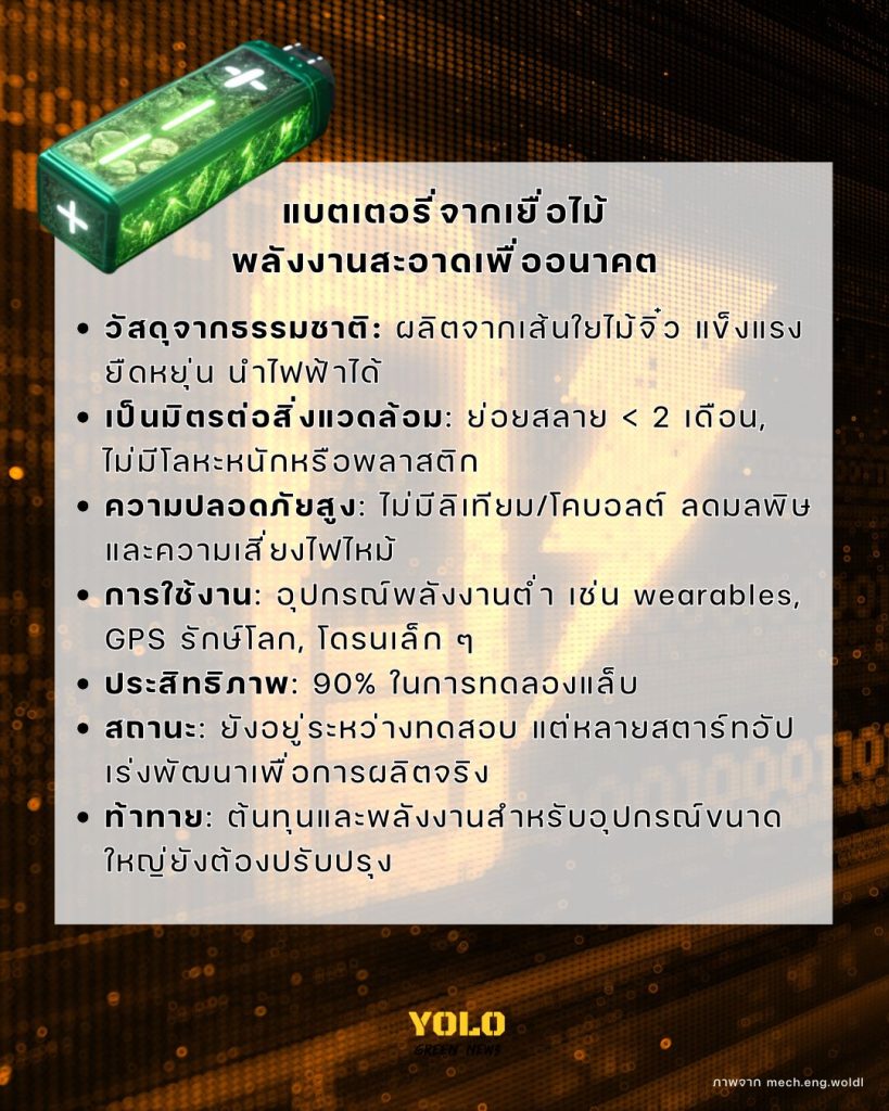 นักวิทยาศาสตร์ได้พัฒนาแบตเตอรี่รักษ์โลกจากเยื่อไม้ ซึ่งสามารถย่อยสลายได้เองภายในไม่ถึงสองเดือนโดยไม่ทิ้งสารพิษหรือขยะอิเล็กทรอนิกส์ แบตเตอรี่ชนิดใหม่นี้ผลิตจากเส้นใยไม้ที่แข็งแรงและยืดหยุ่น สามารถนำไฟฟ้าได้ดีและให้พลังงานแก่อุปกรณ์ขนาดเล็กอย่างโดรน เครื่องติดตามสุขภาพ และอุปกรณ์สวมใส่อัจฉริยะ โดยปราศจากโลหะหนัก พลาสติก และความเสี่ยงจากไฟไหม้ การทดสอบในห้องแล็บแสดงให้เห็นประสิทธิภาพด้านพลังงานสูงถึง 90% ทำให้หลายสตาร์ทอัปเร่งพัฒนาเพื่อการผลิตจริง แม้ยังมีข้อท้าทายด้านต้นทุนและการใช้งานกับอุปกรณ์ที่ใช้พลังงานสูง แต่นวัตกรรมนี้ถือเป็นก้าวสำคัญที่จะเปลี่ยนอนาคตของแบตเตอรี่ไปสู่ความยั่งยืน