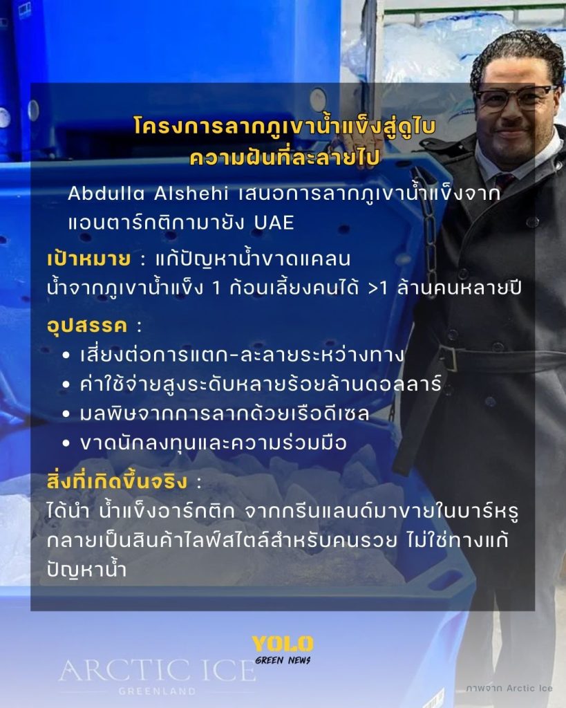ในที่สุด แผนลากภูเขาน้ำแข็งข้าม 5,000 ไมล์ก็ต้องพับเก็บไป เหลือเพียงภาพจำของอีกหนึ่งโครงการยักษ์ที่ไม่เกิดขึ้นจริง สิ่งที่ดูไบได้จริงกลับเป็น “น้ำแข็งอาร์กติก” จากกรีนแลนด์ที่ถูกส่งมาขายให้บาร์หรู ใช้เป็นกิมมิกในค็อกเทลราคาแพง—สัญลักษณ์ชวนขมขื่นของโลกที่ร้อนขึ้น