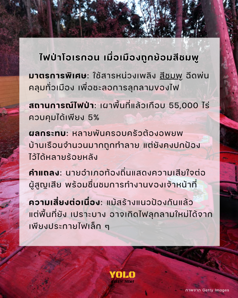 โอเรกอนทั้งเมืองกลายเป็นสีชมพู! เจ้าหน้าที่ดับเพลิงฉีดสารหน่วงเพลิงคุมไฟป่า หลังลุกลามเผาเกือบ 55,000 ไร่