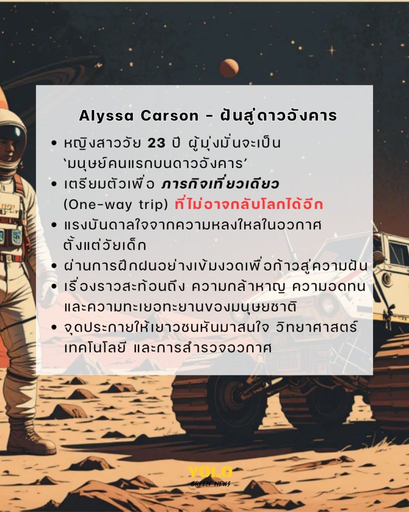 Alyssa Carson หญิงสาววัย 23 ปี กลายเป็นแรงบันดาลใจให้ผู้คนทั่วโลกด้วยความฝันที่จะเป็นมนุษย์คนแรกที่เดินทางไปดาวอังคาร แต่ข่าวลือที่ว่าเธอถูกเลือกให้ไปในภารกิจเที่ยวเดียวและจะไม่มีวันกลับโลกนั้นไม่เป็นความจริง ปัจจุบัน Alyssa เป็นเพียงผู้ที่สนใจและฝึกฝนทักษะด้านอวกาศมาตั้งแต่วัยเด็ก จบการศึกษาด้าน Astrobiology และเคยเป็นทูตให้โครงการเอกชนอย่าง Mars One ทว่าเธอยังไม่ได้รับการแต่งตั้งจาก NASA หรือหน่วยงานอวกาศใดสำหรับภารกิจจริง ทั้งนี้ NASA เองก็ยืนยันว่าภารกิจมนุษย์สู่ดาวอังคารในอนาคตจะเป็นแบบไป-กลับ ไม่ใช่เที่ยวเดียว เรื่องราวของ Alyssa จึงสะท้อนถึงความมุ่งมั่นและแรงบันดาลใจมากกว่าความจริงที่เธอกำลังจะถูกส่งไปดาวอังคารในเร็วๆ นี้