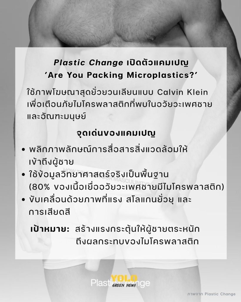 Plastic Change องค์กรสิ่งแวดล้อมจากเดนมาร์กเปิดตัวแคมเปญสุดแหวกแนว ที่นำภาพลักษณ์โฆษณาสุดเซ็กซี่สไตล์ Calvin Klein มาตีความใหม่ เพื่อสะกิดให้ผู้ชายตระหนักถึงอันตรายของไมโครพลาสติก โดยงานวิจัยล่าสุดพบว่าไมโครพลาสติกถูกตรวจพบในอวัยวะเพศชายกว่า 80% และยังพบในอัณฑะทุกตัวอย่างที่ศึกษา ซึ่งอาจสัมพันธ์กับปัญหาภาวะมีบุตรยาก