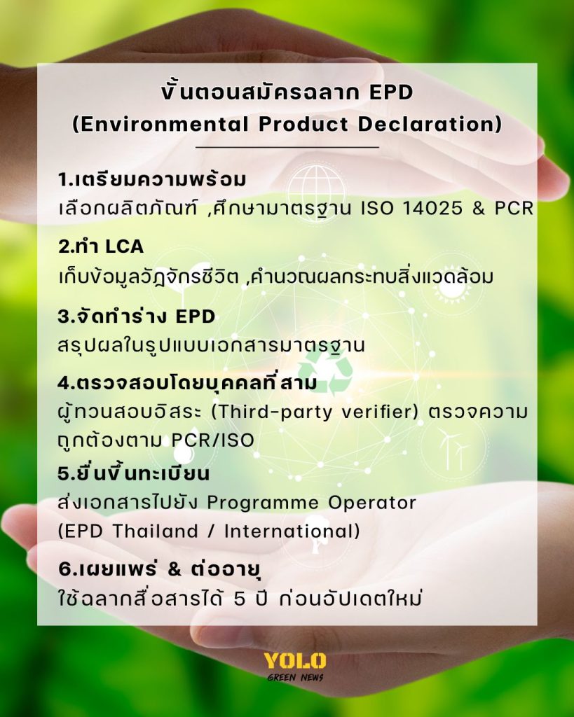 การสมัครขอฉลาก EPD เริ่มจากการทำการประเมินวัฏจักรชีวิตผลิตภัณฑ์ (LCA) เพื่อคำนวณผลกระทบต่อสิ่งแวดล้อม จากนั้นจัดทำรายงานในรูปแบบฉลาก EPD และส่งให้ผู้ตรวจสอบอิสระ (Third-party verifier) รับรองความถูกต้อง ก่อนยื่นขึ้นทะเบียนกับหน่วยงานกำกับ (Programme Operator) เช่น EPD Thailand หรือระบบสากล เมื่อผ่านการรับรอง ผลิตภัณฑ์จะได้รับฉลาก EPD ที่สามารถใช้สื่อสารทางการตลาดและยกระดับความน่าเชื่อถือได้เป็นเวลา 5 ปี