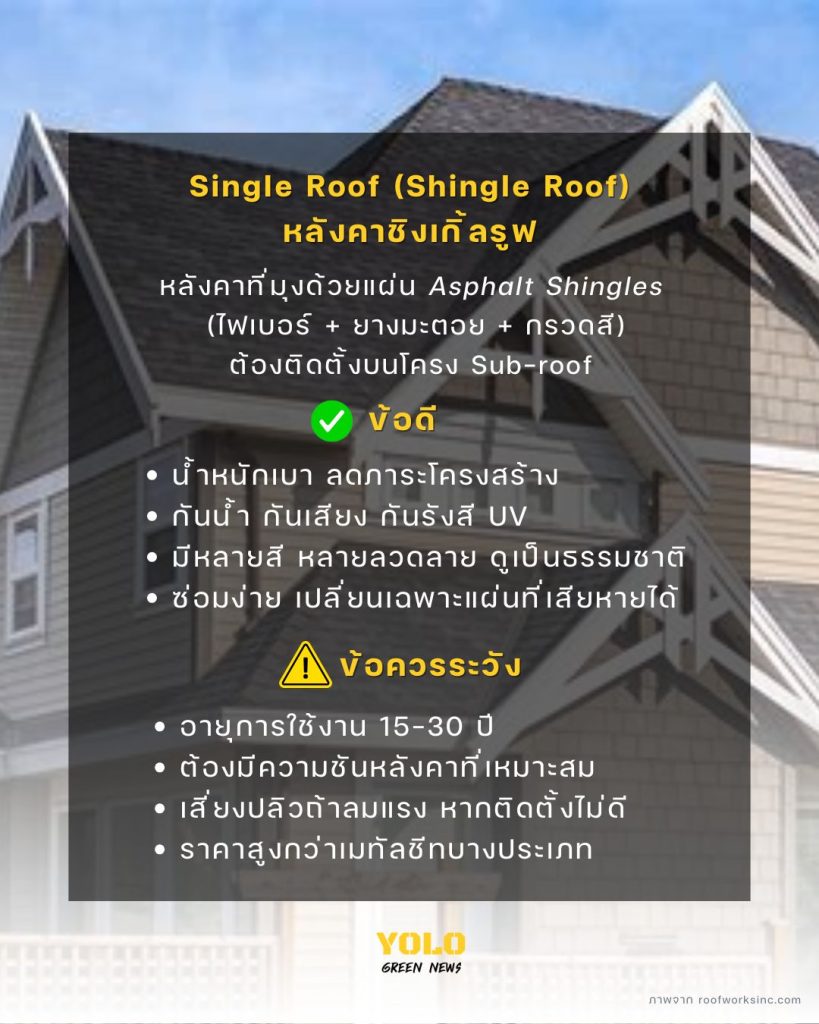 Single Roof หรือ Shingle Roof คือรูปแบบหลังคาที่มุงด้วยแผ่นแอสฟัลต์ชิงเกิ้ล วัสดุที่ผสมผสานระหว่างไฟเบอร์และยางมะตอย เคลือบด้วยกรวดสีเพื่อเพิ่มความทนทานและป้องกันแสงแดด จุดเด่นของหลังคาประเภทนี้คือมีน้ำหนักเบา ช่วยลดภาระโครงสร้าง พร้อมทั้งกันน้ำ กันเสียง และกันรังสี UV ได้ดี อีกทั้งยังมีสีและลวดลายให้เลือกหลากหลาย เหมาะสำหรับบ้านที่ต้องการความสวยงามกลมกลืนกับธรรมชาติ อย่างไรก็ตาม หลังคาชนิดนี้มีอายุการใช้งานเฉลี่ยราว 15–30 ปี ต้องติดตั้งบนหลังคาที่มีความชันที่เหมาะสม และควรเลือกช่างที่มีความชำนาญเพื่อป้องกันปัญหาน้ำรั่วหรือแผ่นปลิวเมื่อเจอลมแรง โดยรวมแล้ว Shingle Roof ถือเป็นอีกหนึ่งทางเลือกที่ตอบโจทย์บ้านสมัยใหม่ที่เน้นทั้งฟังก์ชันและดีไซน์ในเวลาเดียวกัน